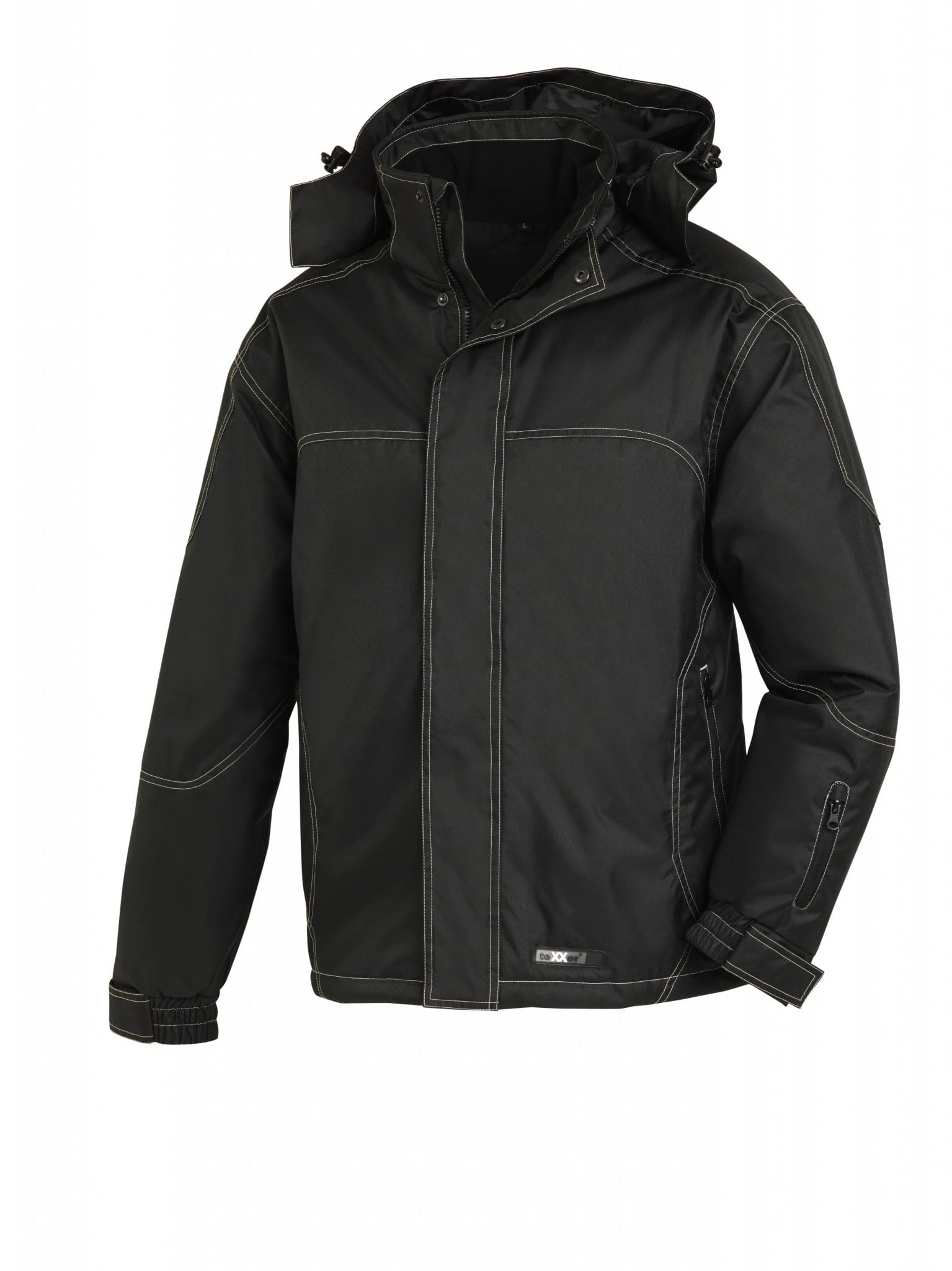 Säädettävä huppu ja joustavat hihat.